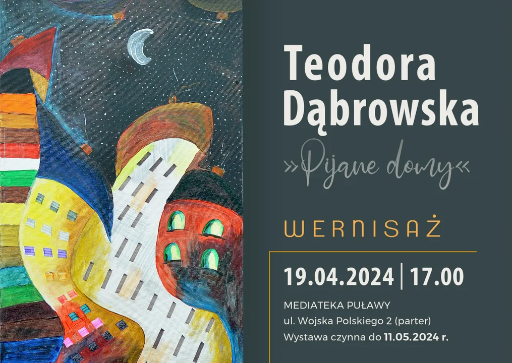 Biblioteka Miejska w Puławach serdecznie zaprasza w piątek 19 kwietnia o godz. 17.00 na wernisaż malarstwa Teodory Dąbrowskiej pt. „Pijane domy”.