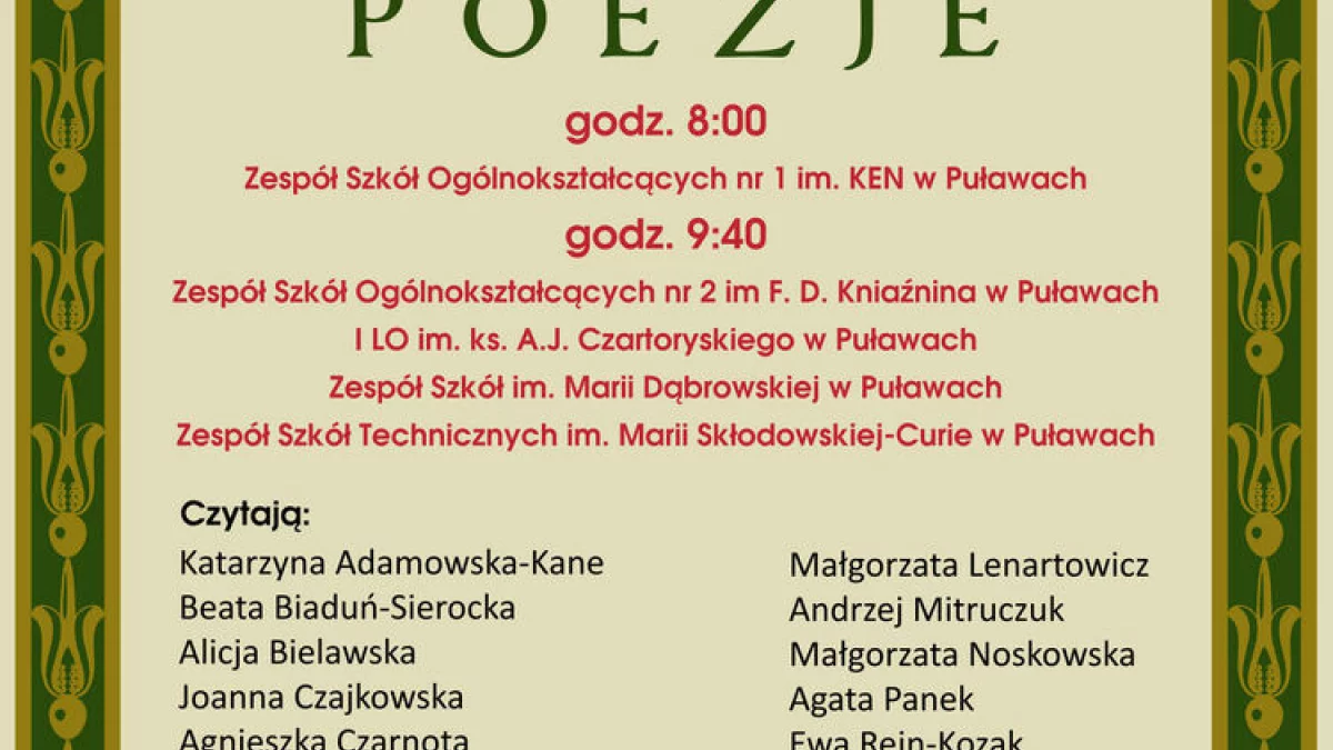 W tym roku Narodowe Czytanie w powiecie puławskim poświęcone jest twórczości Jana Kochanowskiego – poety, który na trwałe zapisał się w historii polskiej literatury, a którego twórczość pozostaje żywa i aktualna również dziś. Uczniowie puławskich szkół będą mieli okazję usłyszeć jego słowa w mistrzowskim wykonaniu lokalnych nauczycieli, animatorów kultury, artystów i działaczy społecznych.