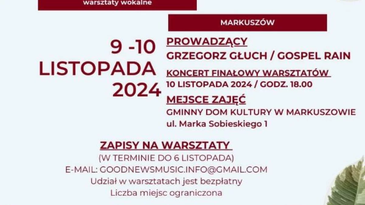 Zajęcia odbędą się 9 i 10 listopada (sobota-niedziela) w siedzibie Gminnego Domu Kultury w Markuszowie (ul. M. Sobieskiego 1). Poprowadzi je Grzegorz Głuch, założyciel i dyrygent zespołu Gopel Rain, działającego od 1991 r.