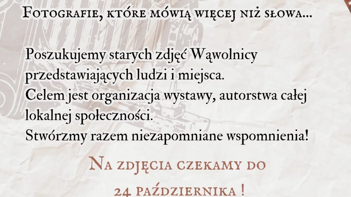 Wąwolnica to nie tylko miejsce, ale też żywa pamięć pokoleń, zapisana w rodzinnych albumach, szufladach, starych pudełkach po butach i walizkach na strychu. Teraz te cenne pamiątki mogą stać się częścią szerszej opowieści dostępnej dla wszystkich. Gminny Dom Kultury w Wąwolnicy ogłosił nabór starych fotografii w ramach projektu „Zatrzymane w czasie”. Celem inicjatywy jest stworzenie wyjątkowej wystawy pokazującej życie codzienne, twarze, wydarzenia, uliczki i detale z przeszłości gminy Wąwolnica. To wspólna podróż w czasie wprost do momentów, które choć minione, wciąż żyją w obrazach.