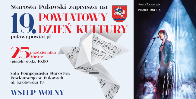 Uroczystość odbędzie się w piątek, 25 października br. o godz. 16:00 w Sali Pompejańskiej puławskiego Starostwa. W programie wydarzenia – obok wręczenia powiatowych laurów kultury – znalazło się także ogłoszenie wyników konkursu wydawniczego oraz prezentacja twórczości rodzimych artystów. Wieczór zwieńczy recital Anety Todorczuk – popularnej aktorki i wokalistki, znanej z ról teatralnych, filmowych, serialowych i dubbingowych. Artystka wystąpi w repertuarze wybranych przez siebie utworów Jonasza Kofty.