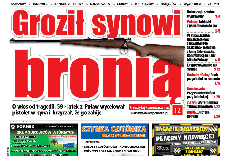 Do zdarzenia doszło w środę po południu na jednym z osiedli domów jednorodzinnych w Puławach. Na posesji przebywali wtedy 59-letni ojciec, 22-letni syn i jego kolega. Janusz M. zaczął krzyczeć na syna i grozić mu śmiercią. Młody mężczyzna przestraszył się i by uniknąć otwartego konfliktu postanowił opuścić dom. Gdy wsiadł do samochodu i chciał odjechać ojciec wymierzył w niego broń. Chłopakowi udało się jednak wyjechać samochodem, ale bał się wrócić do domu, bo nie wiedział jak zareaguje na niego agresywny i uzbrojony rodzic. Syn o zajściu zawiadomił policję, powiedział że ojciec nie dysponuje zezwoleniem na posiadanie broni. Radiowóz szybko przyjechał na miejsce. Okazało się, że 59-latek rzeczywiście nie ma żadnych uprawnień na posiadanie broni palnej. Nielegalny przedmiot został zabezpieczony i odwieziony na puławską komendę - podobnie jak jego agresywny właściciel, zatrzymany do wyjaśnienia.