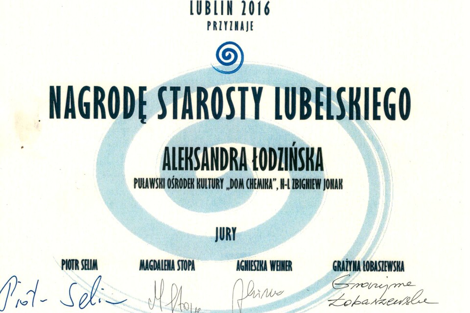 W II etapie Konkursu DEBIUTY organizowanym przez Młodzieżowy Dom Kultury w Lublinie Aleksandra Łodzińska otrzymała nagrodę specjalną Starosty Lubelskiego Pawła Pikuli.