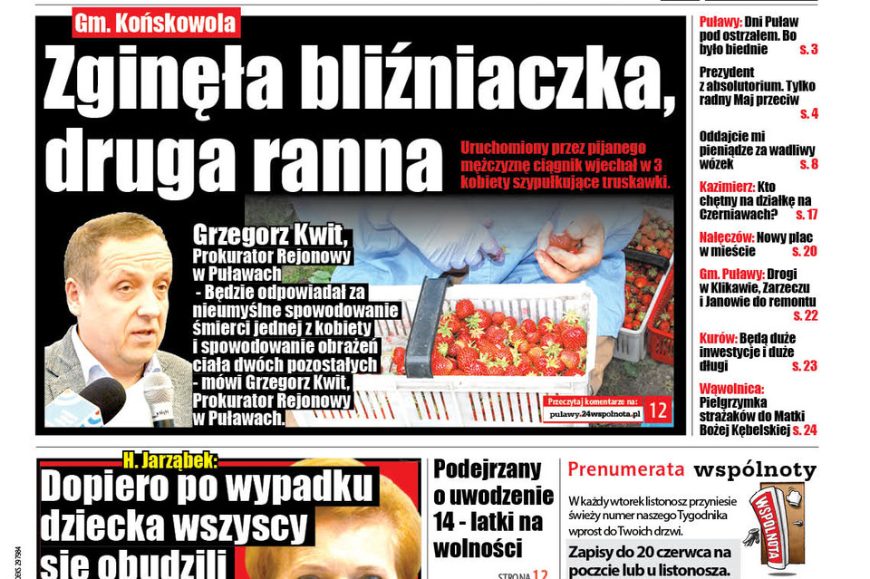 - Mężczyzna mając zamiar napompować koło sprężarką z ciągnika rolniczego stojącego w stodole uruchomił go, nie sprawdzając czy znajduje się na tzw. jałowym biegu - opowiada mł. asp. Ewa Rejn-Kozak, rzecznik prasowy Komendy Powiatowej Policji w Puławach i dodaje: - Pojazd ruszył do przodu i najechał na siedzące przed nim i szypułkujące truskawki kobiety.
