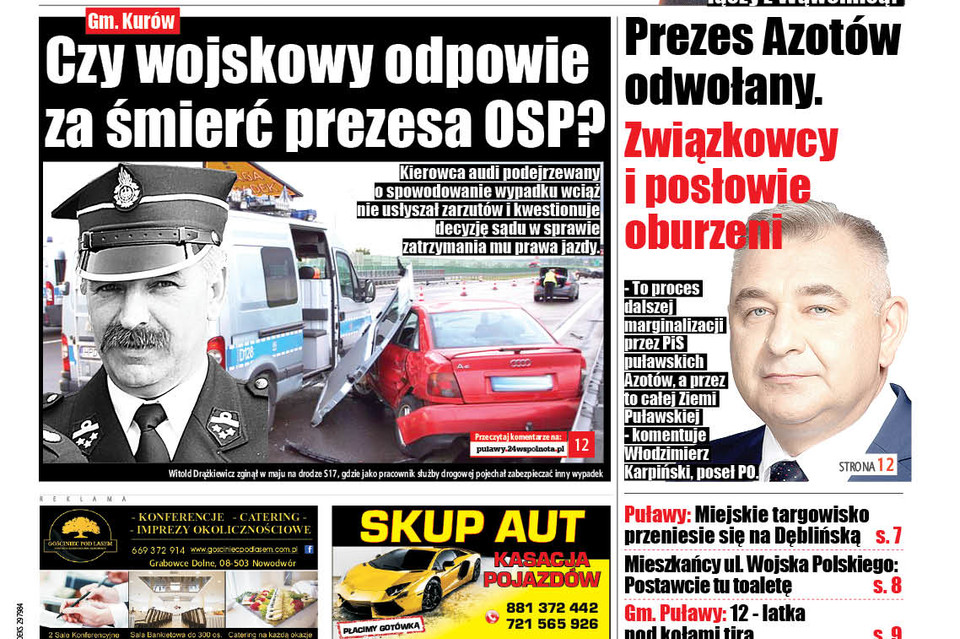 Wracamy do sprawy tragicznego wypadku, w którym zginął prezes Ochotniczej Straży Pożarnej w Kurowie Witold Drążkiewicz. Do zdarzenia doszło 19 maja  na odcinku łączącym drogi S17 i S12. Prezes Witold Drążkiewicz pracował w firmie służby drogowej, która zabezpieczała miejsce innego wypadku. 47-letni kierowca audi jadący tą trasą uderzył w samochody służby drogowej i jej dwóch pracowników. Następnie rozpędzone auto staranowało radiowóz policyjny i zatrzymało się na barierach energochłonnych.