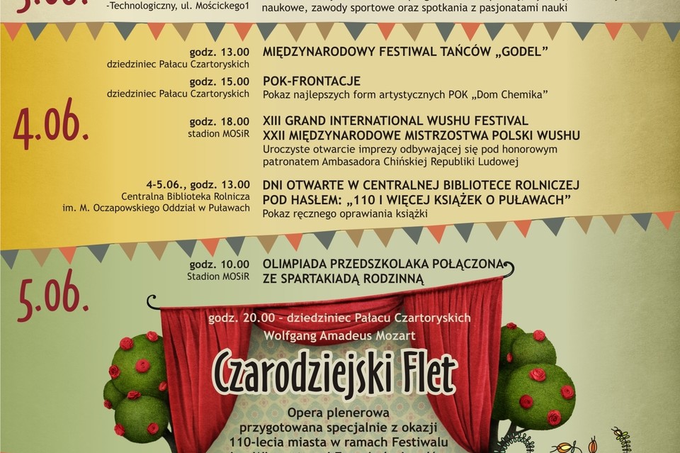 - godz. 20:00, dziedziniec Pałacu Czartoryskich - "Czarodziejski Flet" Wolfganga Amadeusza Mozarta - opera plenerowa przygotowana specjalnie z okazji 110-lecia miasta w ramach Festiwalu im. Wincentego i Franciszka Lesslów, iluminacja Pałacu Czartoryskich.