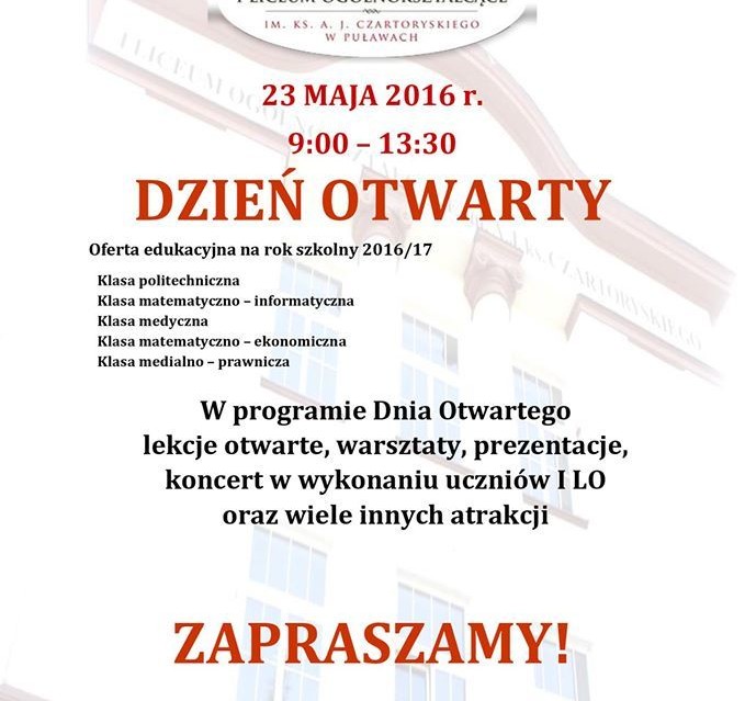 Podczas tego dnia szkoła zaprezentuję swoją ofertę edukacyjną, przeprowadzone zostaną lekcje otwarte, warsztaty, prezentację oraz koncert w wykonaniu uczniów I LO.