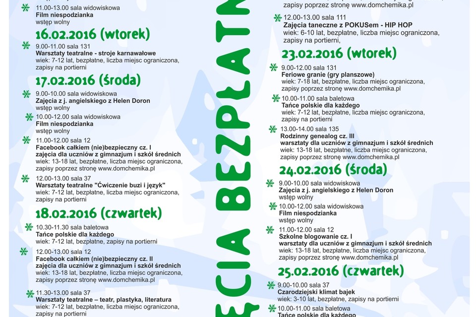 - 9:00-11:00, sala 131 - Warsztaty teatralne - stroje karnawałowe - wiek:7-12 lat, zajęcia bezpłatne