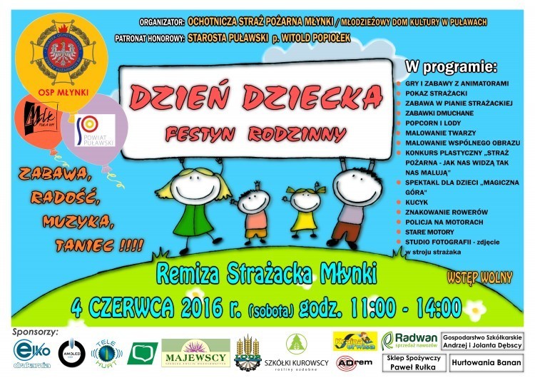 Festyn Rodzinny z okazji Dnia Dziecka odbędzie się w sobotę, 4 czerwca 2016 r. w godz. 11:00-14:00 w Remizie Strażackiej Młynki. Wstęp wolny!