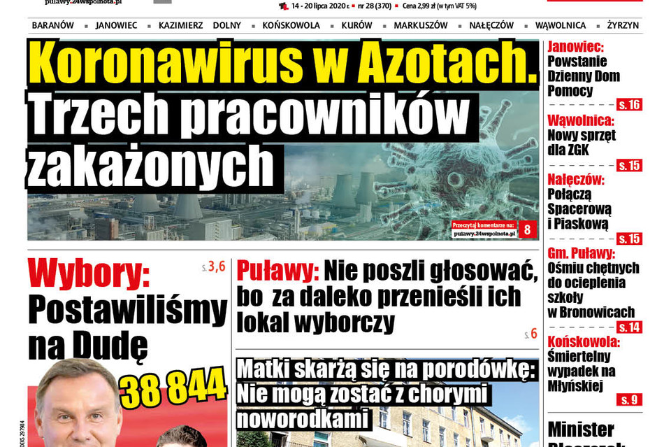 - U trzech pracowników Grupy Azoty Puławy stwierdzono w ostatnich dniach pozytywny wynik testu na koronawirusa. Kilkunastu pracowników jest też skierowanych przez sanepid na kwarantannę. Część z nich miało już wykonane testy, ich wynik jest negatywny. Pozostałe osoby czekają na badanie, ale kontakt z zakażonymi mieli w okresie od sześciu do kilkunastu dni temu i do dziś nie wykazują żadnych niepokojących objawów - informowała w miniony piątek Katarzyna Hałat.