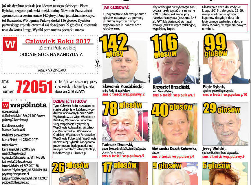Głosowanie trwa do środy 28 lutego 2018 r. do godz. 23.59, uwaga o wliczeniu głosów z kuponów decyduje data ich faktycznego wpłynięcia do siedziby redakcji w regulaminowym terminie.