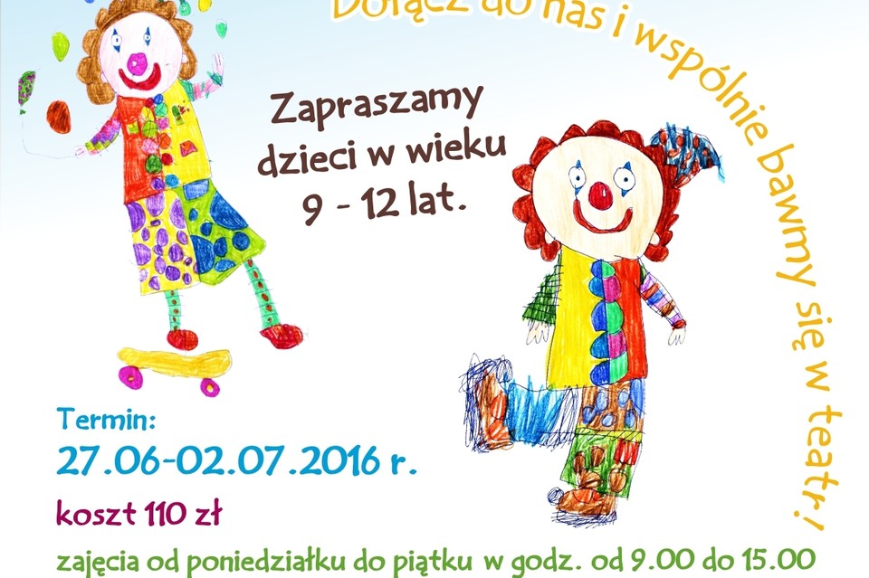 Letnie warsztaty teatralne odbędą się w dniach 27 czerwca - 2 lipca 2016 r. Zajęcia odbywać się będą od poniedziałku do piątko w godz. 9:00-15:00 oraz w soboty w godz. 14:00-19:00.
