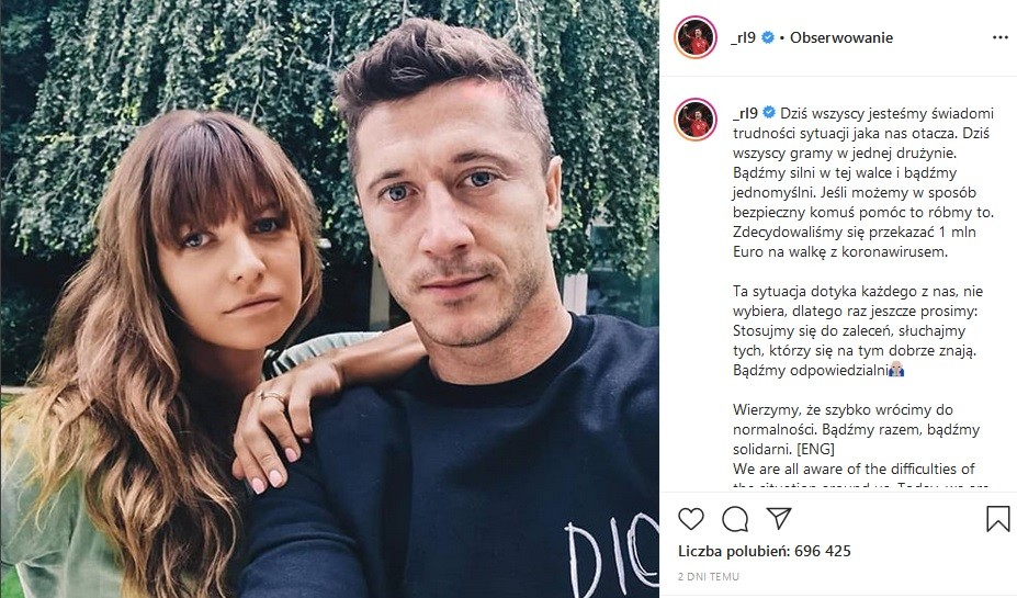 - Dziś wszyscy jesteśmy świadomi trudności sytuacji jaka nas otacza. Dziś wszyscy gramy w jednej drużynie. Bądźmy silni w tej walce i bądźmy jednomyślni. Jeśli możemy w sposób bezpieczny komuś pomóc to róbmy to. Zdecydowaliśmy się przekazać 1 mln Euro na walkę z koronawirusem - napisał Robert Lewandowski na swoim profilu na Instagramie.