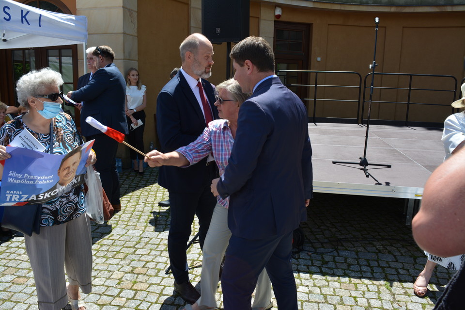 Choć spotkanie było zdominowane przez działaczy i zwolenników rządzącej partii i urzędującego prezydenta, nie zabrakło na nim sympatyków opozycji. Przechadzali się oni obok tłumu, prezentując plakaty wyborcze Rafała Trzaskowskiego. Kilka osób zareagowało na to nerwowo. Najpierw na zwolenników opozycji krzyczano, żeby sobie poszli, bo to nie ich wiec. Później doszło do przepychanek, a kilka plakatów zostało porwanych. Nawet gdy premier już odjechał, zwolennicy obu kandydatów zostali na placu, gdzie jeszcze chwilę dyskutowali.