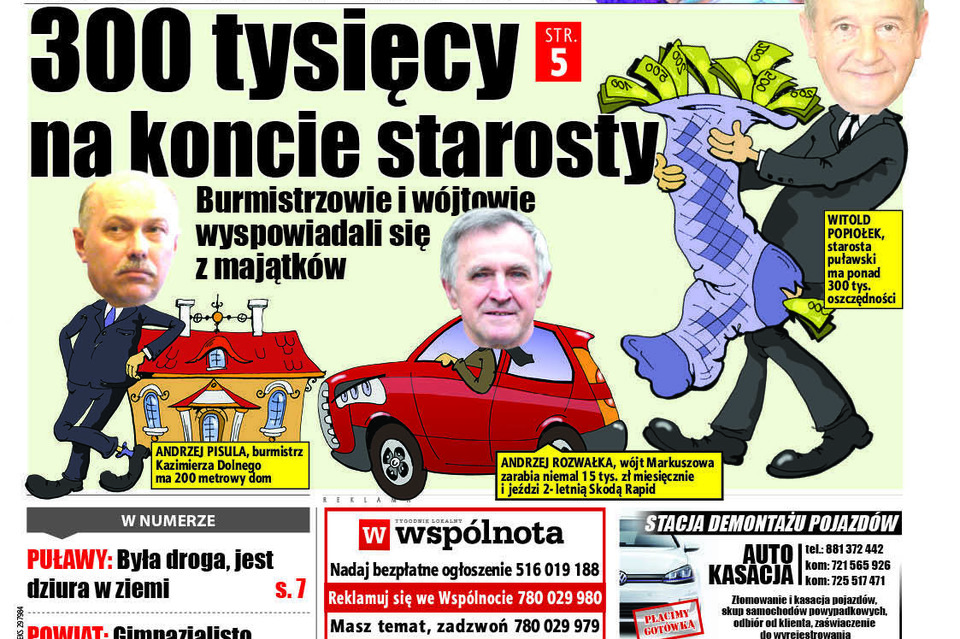 W porównaniu z ubiegłorocznymi sprawozdaniami u wielu włodarzy pensje nie zmalały, a wzrosły. Z podwyżki mogą cieszyć się między innymi burmistrz Kazimierza Dolnego, Andrzej Pisula, którego roczny dochód zwiększył się o niemal 19 tys. zł. Więcej do portfela wpływa także najmłodszemu wójtowi z naszego powiatu, Marcinowi Łagunie, który rządzi Wąwolnicą. Jego roczne dochody kształtują się teraz na poziomie prawie 99 tys. zł, zamiast niemal 92 tys. zł. Wzrost na koncie zanotowali także Andrzej Bujek z gminy Żyrzyn i Andrzej Ćwiek, burmistrz Nałęczowa. Pierwszy zarabia teraz więcej o około tysiąc złoty, drugi może cieszyć się podwyżką w wysokości około dwóch tysięcy złotych. Co więcej dzięki podwyżce burmistrz Nałęczowa zdołał już zgromadzić na swoim koncie oszczędności w kwocie ponad 40 tys. zł.