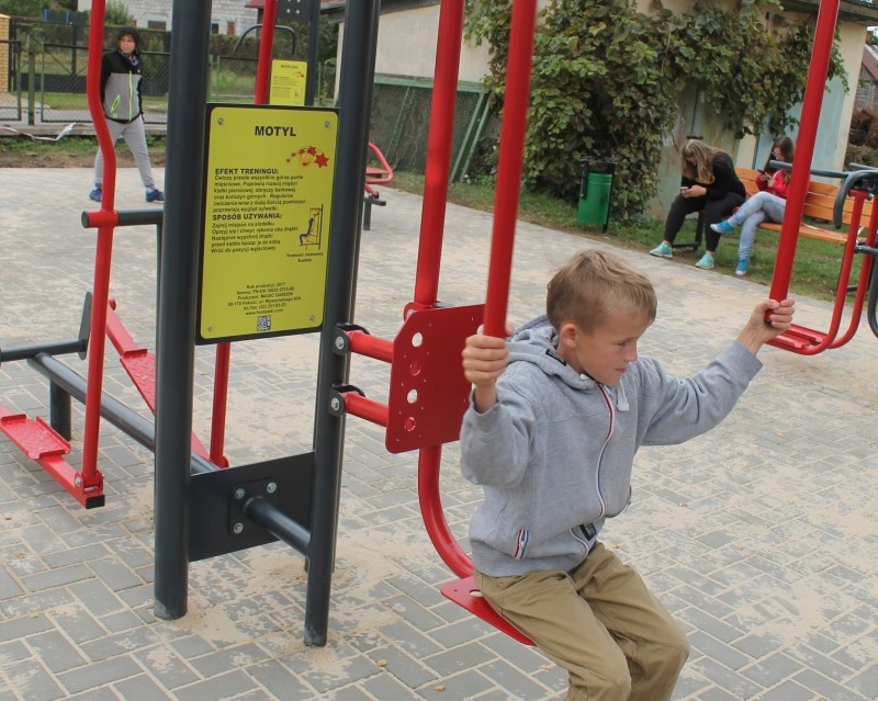 Na placu zamontowano różnorodne urządzenia m.in. biegacz, wahadło, stepper, wioślarz, pajacyk, twister, motyl, orbitrek, bujak i huśtawka. Wyposażenie dodatkowe stanowi altana, ławostół, ławka, kosz na śmieci i tablica informacyjna z regulaminem. Nawierzchnia placu została utwardzona kostką brukową.
