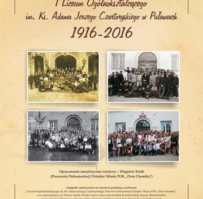 Otwarcie wystawy "100-lecie I Liceum Ogólnokształcącego im. Ks. Adama Jerzego Czartoryskiego w Puławach 1916-2016" odbędzie się w piątek, 24 czerwca 2016 r. o godz. 9:30 na Plac im. Fryderyka Chopina.