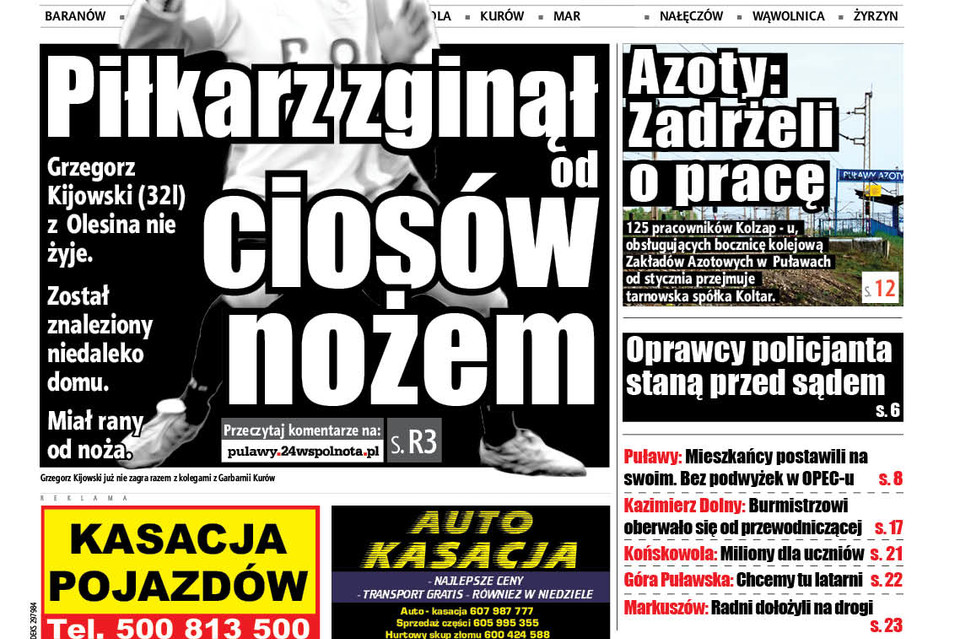 - W niedzielę rano zostaliśmy powiadomieni, że w pobliży bloków w Kurowie przechodzień znalazł nieprzytomnego mężczyznę. Policjanci na miejscu stwierdzili, że mężczyzna posiada rany kłute i nie oddycha. Lekarz pogotowia stwierdził zgon. Po oględzinach prokuratora i biegłego z zakresu medycyny sądowej ciało przewieziono do Lublina na sekcję zwłok - informuje mł. asp. Ewa Rejn-Kozak z KPP Puławy.