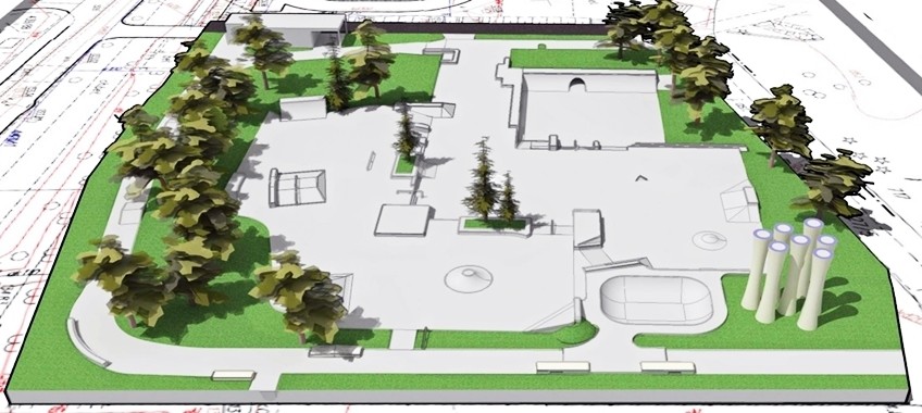 - przebudowę budynku gospodarczego z przeznaczeniem na prowadzenie wypożyczalni sprzętu sportowego oraz zakup wyposażenia sprzętu sportowego do wypożyczalni. Przy budynku zaprojektowano ścianki betonowe przeznaczone pod graffiti.