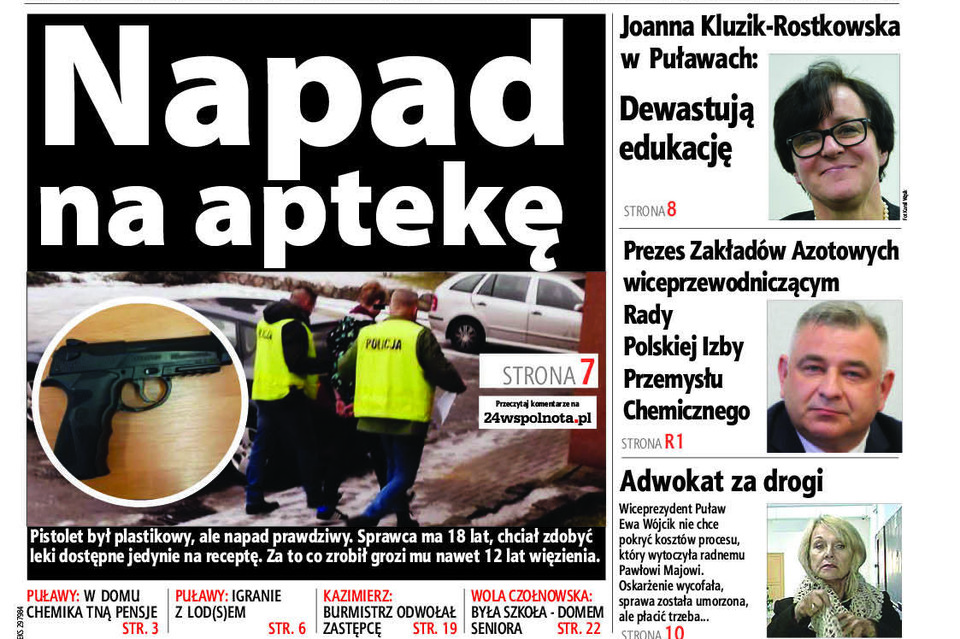 Dramatyczne wydarzenia rozegrały się 21 stycznia w samoobsługowej aptece przy ulicy Skłodowskiej w śródmieściu Puław. Zamaskowany sprawca w biały dzień wszedł do środka, w ręku trzymał pistolet. Zażądał konkretnych leków i pieniędzy. Pracująca w aptece kobieta w obawie o swoje życie wydała to, czego chciał. Napastnik jednak nie zdążył zabrać wszystkiego, bowiem w tym momencie pojawiła się inna klientka, to go speszyło i spłoszyło.