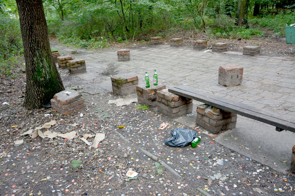 Najwięcej śmieci sprzątanych w tamtym rejonie przez ZUK to puszki i butelki, a także opakowania po jedzeniu, np. torebki po chipsach chętnie konsumowanych przy piwku. Na małym zacienionym placu za skateparkiem, gdzie poza zasięgiem monitoringu wiele osób chętnie spożywa alkohol, zobaczyć można całą niechlubną galerię pozostałych po imprezowiczach korków od butelek. Dyrektor ZUK przyznaje jednak, że ślady libacji to nie jedyne śmieci znajdowane w lasku.
