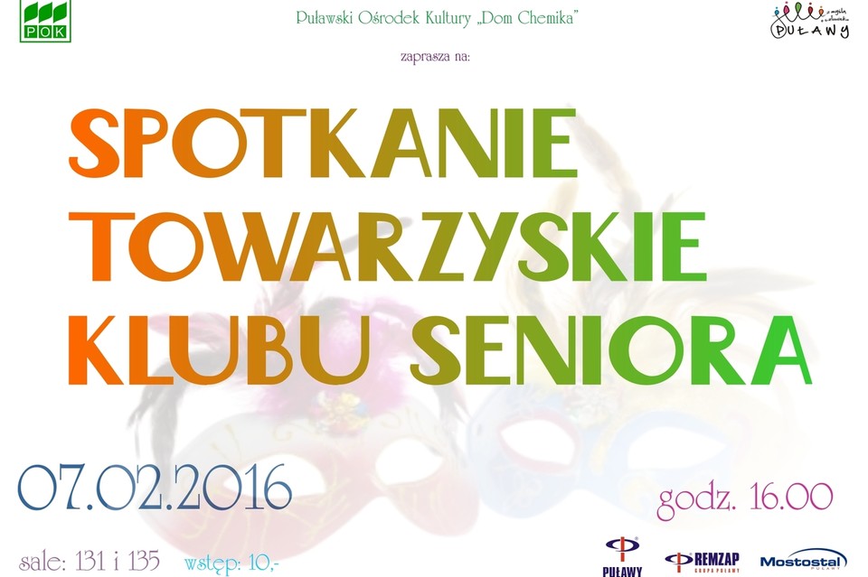 Spotkanie Towarzyskie Klubu Seniora odbędzie się w niedzielę, 7 lutego 2016 r. o godz. 16:00 w salach 131 i 135 w Puławskim Ośrodku Kultury "Dom Chemika". Wstęp 10 zł.