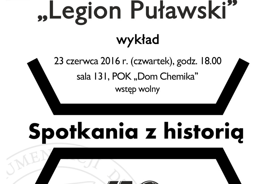 Zapraszamy na szóste "Spotkanie z historią", które zostanie poświęcone Legionowi Puławskiemu – formacji zbrojnej z czasów I wojny światowej. Zagadnienie przybliży Mariusz Karolak. Wykład zostanie uzupełniony prezentacją multimedialną. Będzie to ostatnie spotkanie z tego cyklu przed wakacjami. Kolejny wykład odbędzie się dopiero w drugiej połowie września.