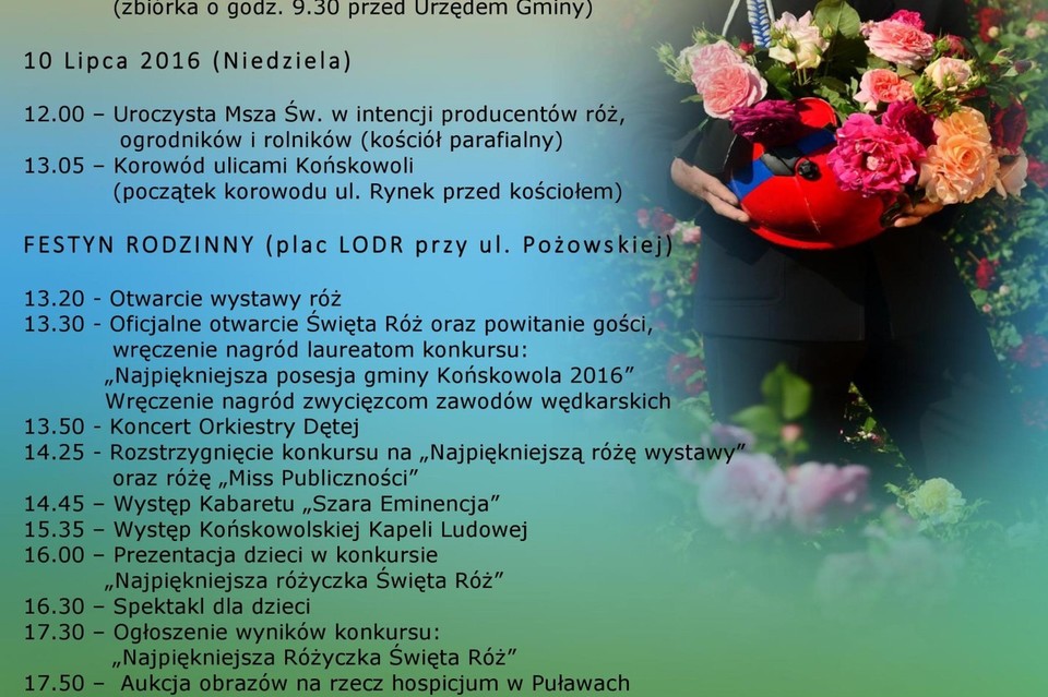 W niedzielę po Mszy Świętej w intencji producentów róż, ogrodników i rolników ulicami miasta przejdzie korowód. Po godz. 13:00 na placu przy ul. Pożowskiej odbędzie się oficjalne otwarcie XIX Święta Róż. Podczas festynu rodzinnego na scenie wystąpią m.in.: Orkiestra Dęta, kabaret "Szara Eminencja", Końskowolska Kapela Ludowa, zespoły "Max", "Verdis" oraz "Cliver".