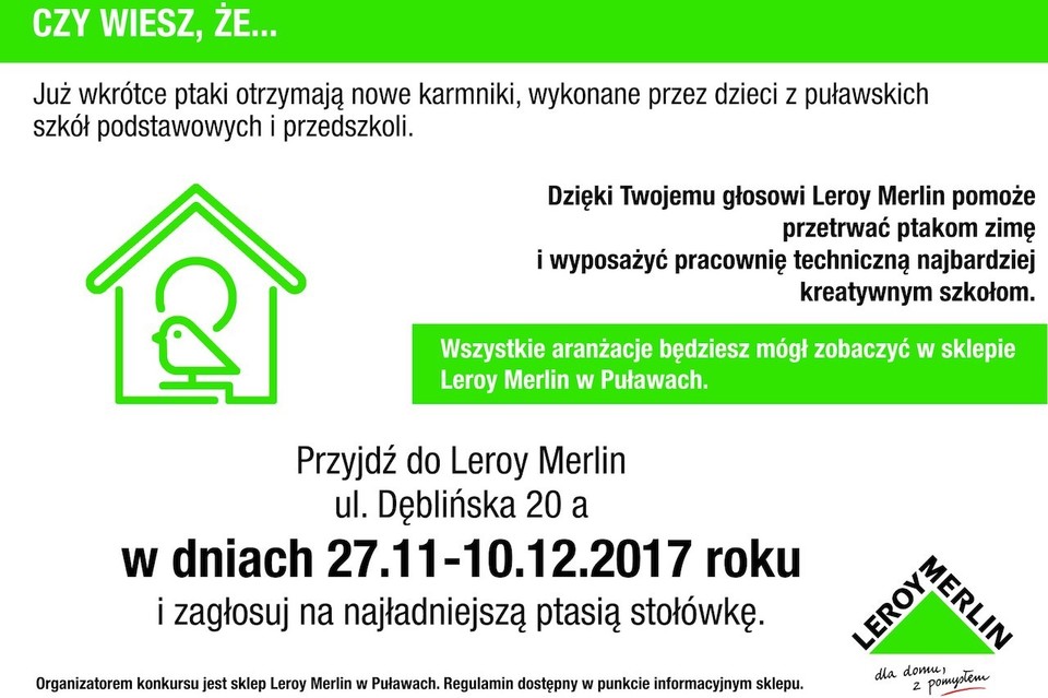 - Zima już tuż tuż dlatego Leroy Merlin w Puławach zorganizował konkurs na zbudowanie „stołówek dla ptaków". Konkurs polega na zbudowaniu i udekorowaniu karmników z materiałów przekazanych przez sklep. Szkoły oraz przedszkola z całego województwa lubelskiego licznie zgłosiły się do udziału w konkursie – opowiada Aleksander Filipek z puławskiego Leroy Merlin.