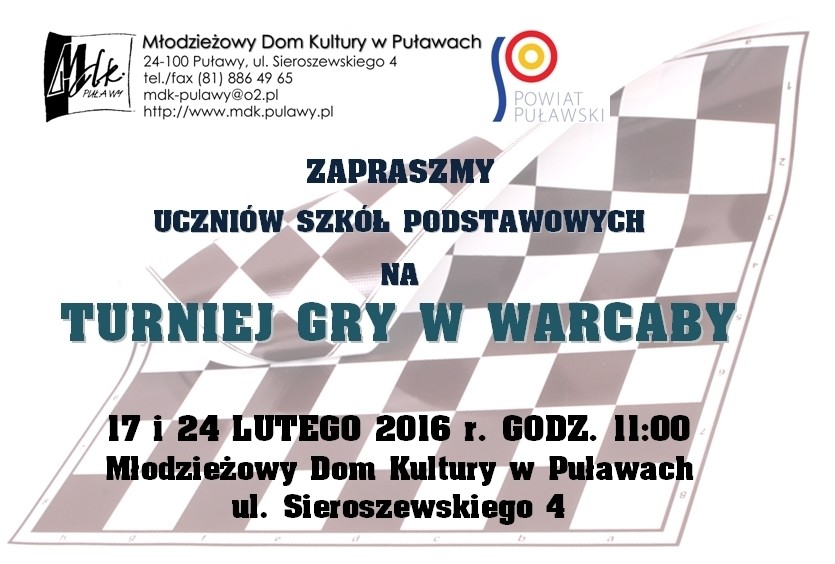 Turniej skierowany do uczniów szkół podstawowych odbędzie się 17 i 24 lutego 2016 r. o godz. 11:00 w MDK w Puławach, ul. Sieroszewskiego 4.