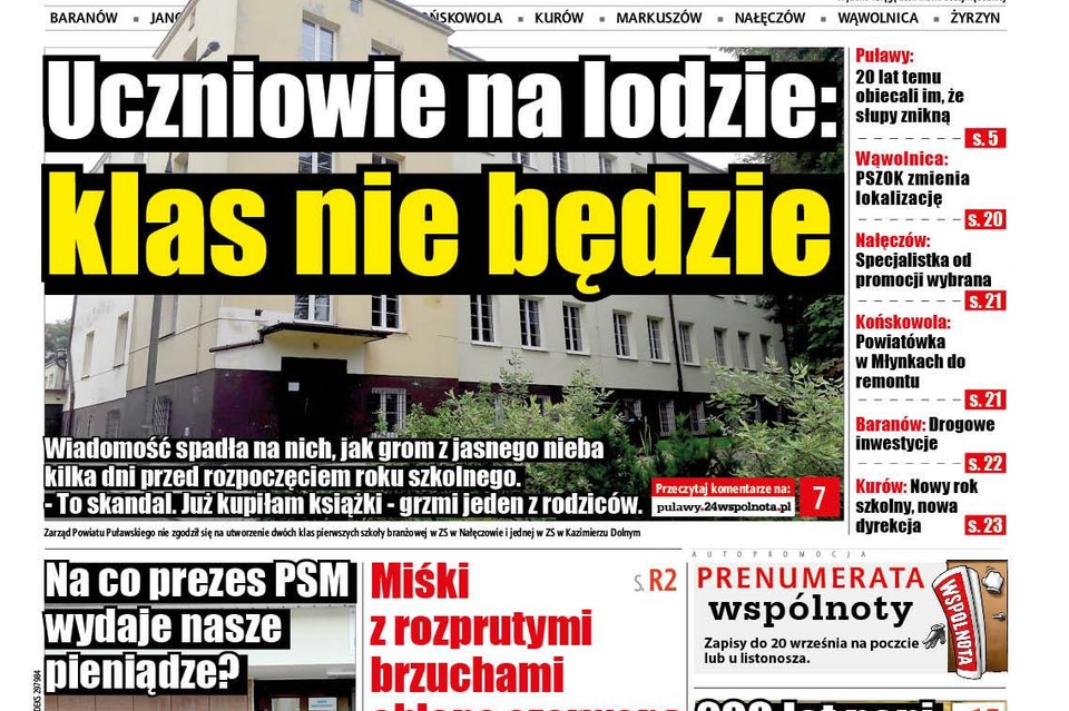 Chodzi o klasy pierwsze szkół branżowych I stopnia, jakie miały od września powstać w Zespole Szkół nr 2 w Nałęczowie i Zespole Szkół im. Jana Koszczyca Witkiewicza w Kazimierzu Dolnym. W ubiegłą środę zaledwie kilka dni przed rozpoczęciem nowego roku szkolnego na uczniów i rodziców, jak grom z jasnego nieba spadła wiadomość, że klas tych jednak nie będzie i muszą szukać sobie miejsca w innej szkole.