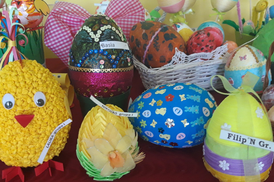 W bieżącym roku szkolnym organizowane były trzy takie konkursy. Rodzice wraz z dziećmi przygotowywali stroiki bożonarodzeniowe, prace o tematyce „Zwiastuny wiosny”, a obecnie nasze przedszkole zdobią pisanki wielkanocne.