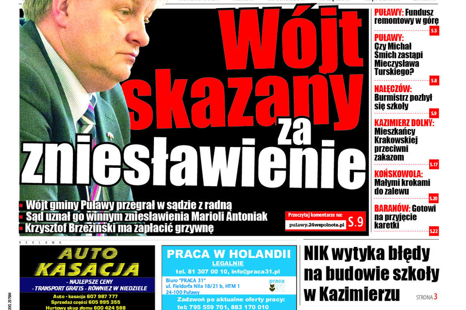 - Sąd tym razem uznał wójta za winnego zniesławienia oskarżycielki prywatnej. Panu wymierzono karę 120 stawek dziennych grzywny, ustalając wysokość jednej stawki na 40 zł, a więc 4.800 zł grzywny. Zasądzono zadośćuczynienie na rzecz pokrzywdzonej w kwocie 3 tys. zł i orzeczono o podaniu wyroku do publicznej wiadomości przez odczytanie go na najbliższej sesji rady gminy, której radną jest oskarżycielka i zamieszczenie odpisu tego wyroku na tablicy ogłoszeń tego urzędu przez okres 30 dni. Zasądzono także koszty od oskarżonego na rzecz oskarżycielki prywatnej - tłumaczy Joanna Chimosz, prezes Sądu Rejonowego w Puławach.