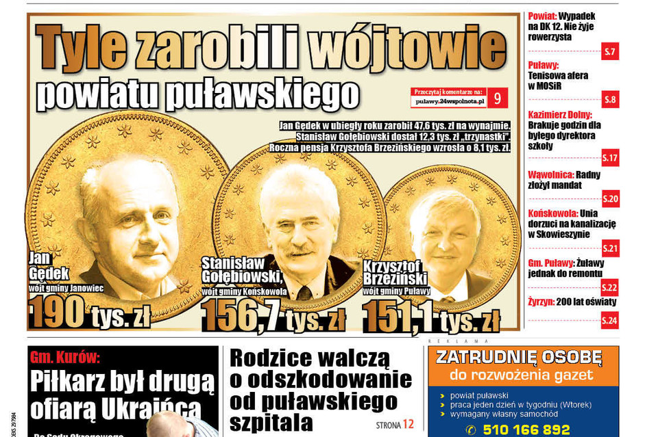 Jak co roku, tak i tym razem z końcem kwietnia wójtowie na biurko wojewody złożyli oświadczenia majątkowe. W dokumentach za 2017 rok wskazywali m.in. jakie osiągnęli dochody, jakie mają samochody, domy czy mieszkania. Okazuje się, że w porównaniu z ubiegłym rokiem 5 na 8 włodarzom puławskich gminy podskoczyły zarobki. Największą różnicę na koncie poczuł wójt Wąwolnicy, który zarobił o 24,5 tys. zł więcej, niż rok wcześniej. Na drugim miejscu pod tym względem uplasowali się Stanisław Wójcicki i Andrzej Bujek, których roczne pensje wzrosły odpowiednio o 10,5 tys. zł i 10 tys. zł. Ale to nie wszystko, bo od wójta Kurowa niejeden mógłby się uczyć trudnej sztuki oszczędzania i inwestowania. Wójcicki chwali się 3 lokatami na łączną kwotę prawie 300 tys. zł, a dodatkowo ma papiery wartościowe na ponad 260 tys. zł. Po drugiej stronie szali, czyli najsłabiej zarabiających włodarzy jest wójt gminy Markuszów, w który w porównaniu z 2016 rokiem w ubiegłym zarobił ponad 7 tys. zł mniej. Ale za to ma najmłodszy samochód, trzyletnią Skodę Rapid. Co inni mają w kieszeni i na koncie?