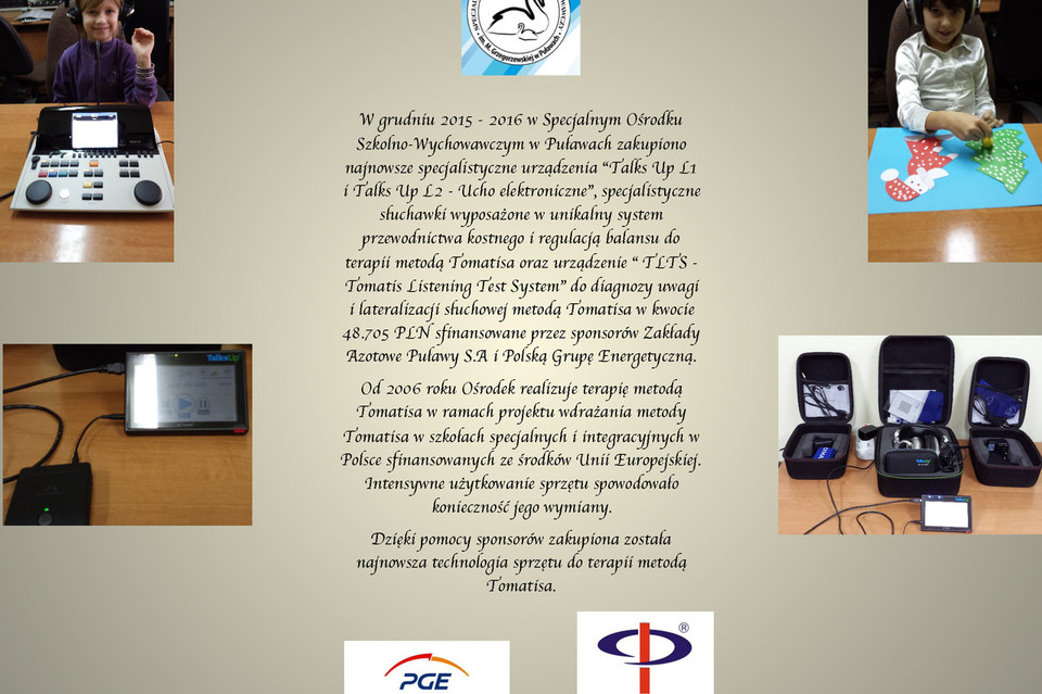 W skład zakupionych urządzeń wchodzą: "Talks Up L1 i Talks Up L2 - Ucho elektroniczne", specjalistyczne słuchawki wyposażone w unikalny system przewodnictwa kostnego i regulacją balansu do terapii metodą Tomatisa oraz urządzenie "TLTS - Tomatis Listening Test System" do diagnozy uwagi i lateralizacji słuchowej metodą Tomatisa w kwocie 48.705 PLN. Zakup został sfinansowany przez sponsorów: Zakłady Azotowe Puławy S.A i Polską Grupę Energetyczną.