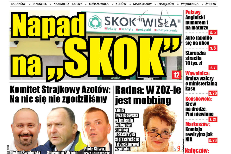 Do napadu na placówkę przy ul. Kołłątaja doszło w piątek około 11:30. Zamaskowany mężczyzna wszedł do oddziału z pistoletem hukowym i oddał strzał w podłogę. Przestraszone pracownice wydały mu gotówkę, a ten szybko uciekł. Jak informuje SKOK, sprawca zabrał sumę w granicach 7 tys. zł. W zdarzeniu nikomu nic się nie stało.