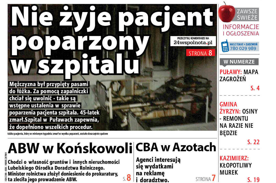 To zeznania jednego z nich rzucają nowe światło na dramatyczne wydarzenia sprzed tygodnia. Jak dowiedzieliśmy się nieoficjalnie, złożył je pacjent przebywający na sali razem z 45-latkiem. Wynika z nich, że mężczyzna był przypięty pasami czy też przywiązany do łóżka. Z pomocą zapalniczki chciał się oswobodzić, bezskutecznie. Niestety od niewielkiego płomienia zajęła się pościel, później materac i dalej łóżko. To tłumaczyłoby skalę obrażeń poszkodowanego i konieczność przewiezienia do Centrum w Łęcznej.