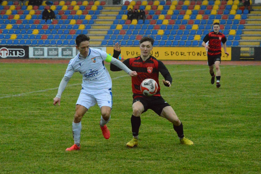 Od początku spotkania lepiej prezentowali się biało-niebiescy, którzy napierali na bramkę gości. W 25 minucie faulowany w polu karnym przeciwników był Piotr Giel. Arbiter główny wskazał na "wapno", a po chwili "jedenastkę" wykorzystał Krystian Puton. Zaledwie siedem minut później prowadzenie podwyższył Robert Janicki.
