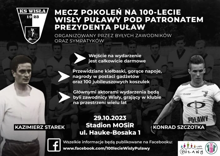 To już 29 października. Początek o godz. 10.30 na stadionie Miejskiego Ośrodka Sportu i Rekreacji w Puławach przy ul. Hauke-Bosaka 1. Wejście jest całkowicie darmowe. Przewidziane są kiełbaski, gorące napoje, nagrody w postaci gadżetów oraz stu jubileuszowych koszulek. Głównymi aktorami wydarzenia będą byli zawodnicy Wisły, grający w klubie na przestrzeni wielu lat.