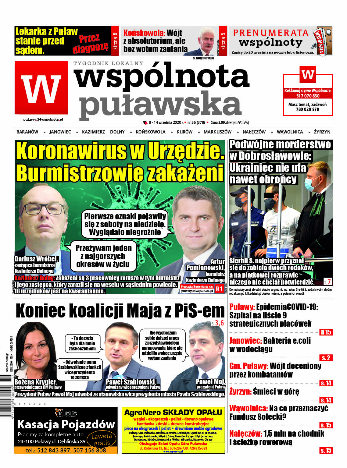 Pierwsze informacje o koronawirusie w kazimierskim ratuszu pojawiły się we wtorek 1 września. Już dzień wcześniej burmistrz Artur Pomianowski podjął decyzję o zamknięciu urzędu dla interesantów do odwołania. Pozytywny wynik testu miał otrzymać jeden z pracowników, który chorobę przechodził bez objawów. Chociaż oficjalnie nie podawano tej informacji i tak na jaw wyszło, że chodzi o zastępcę burmistrza, Dariusza Wróbla. Z kolei burmistrz Artur Pomianowski we wtorkowe południe pisał na swoim FB, że właśnie przechodzi test w szpitalu. Na drugi dzień okazało się, że i on zachorował z powodu zakażenia koronawirusem. W jego przypadku nie obyło się bez objawów – gorączka, ból mięśni, osłabienie.