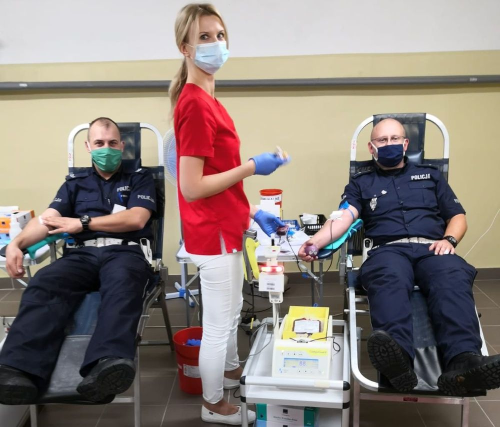 Autor: KPP Puławy | Opis: O tym, jak bardzo potrzebna jest krew, nikogo z naszych funkcjonariuszy i pracowników przekonywać nie trzeba. Mając na co dzień do czynienia z osobami potrzebującymi pomocy, policjanci regularnie oddają krew, wspierając osoby chore – dzieci, uczestników wypadków, a także funkcjonariuszy, również z innych województw. Nie ma tygodnia żeby do puławskiego Oddziału Centrum Krwiodawstwa i Krwiolecznictwa nie zgłosił się ktoś z nas, zwłaszcza teraz, w okresie panującej pandemii. Czasami okazuje się również, że pomoc potrzebna jest jednemu z nas. dwaj policjanci oddający krew oraz pielęgniarka W tym tygodniu policjanci i pracownicy puławskiej jednostki, na czele z Komendantem Powiatowym Policji w Puławach podinspektorem Rafałem Skoczylasem, oddajli krew dla naszego kolegi z Warszawy – młodszego aspiranta Rafała Nierodzika. Rafał, na co dzień dzielnicowy na Mokotowie, przebywa obecnie w szpitalu w Warszawie z powodu zakażenia koronawirusem. Jego stan lekarze określają jako ciężki. krew w worku w centrum krwiodawstwa Chcąc pomóc mu wrócić do zdrowia oraz żony i dwójki wspaniałych dzieci, oddajemy honorowo krew i zachęcamy do tego inne osoby. Na nasz apel odpowiedzieli, jak zawsze niezawodni – uczniowie klas mundurowych z Zespołu Szkół numer 3 w Puławach, w tym absolwenci, którzy w ten szczególny sposób postanowili uczcić rozpoczęcie roku akademickiego. Obojętni nie pozostali również inni krwiodawcy, poruszeni historią naszego kolegi. Cała akcja odbywa się przy ogromnym wsparciu kierownictwa i personelu Oddziału Terenowego Regionalnego Centrum Krwiodawstwa i Krwiolecznictwa w Puławach, za co serdecznie dziękujemy. Zachęcamy do honorowego oddawania krwi, a Rafałowi Nierodzikowi, dla którego z Puław płyną życiodajne krople krwi, życzymy szybkiego powrotu do zdrowia.